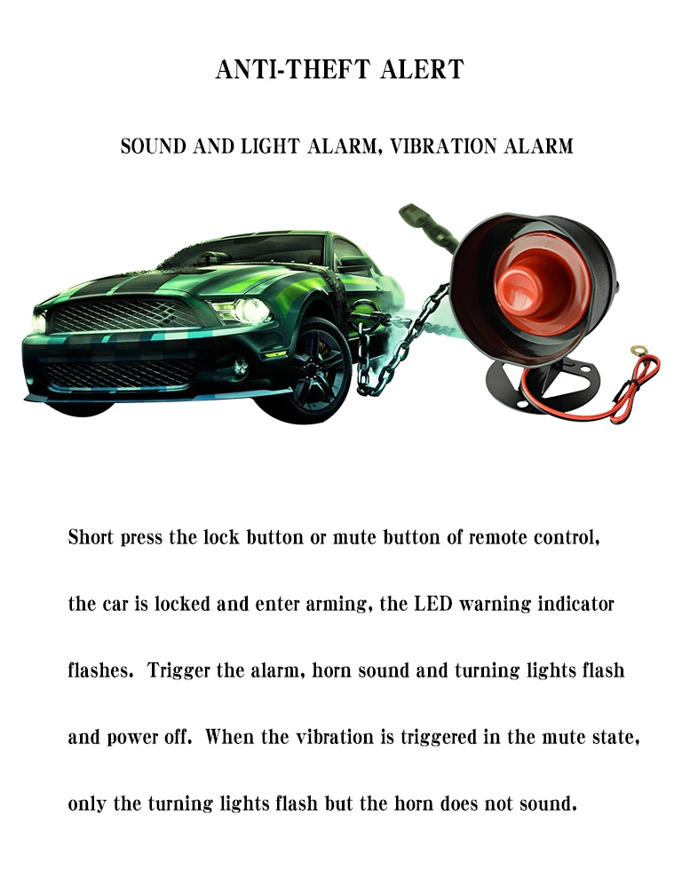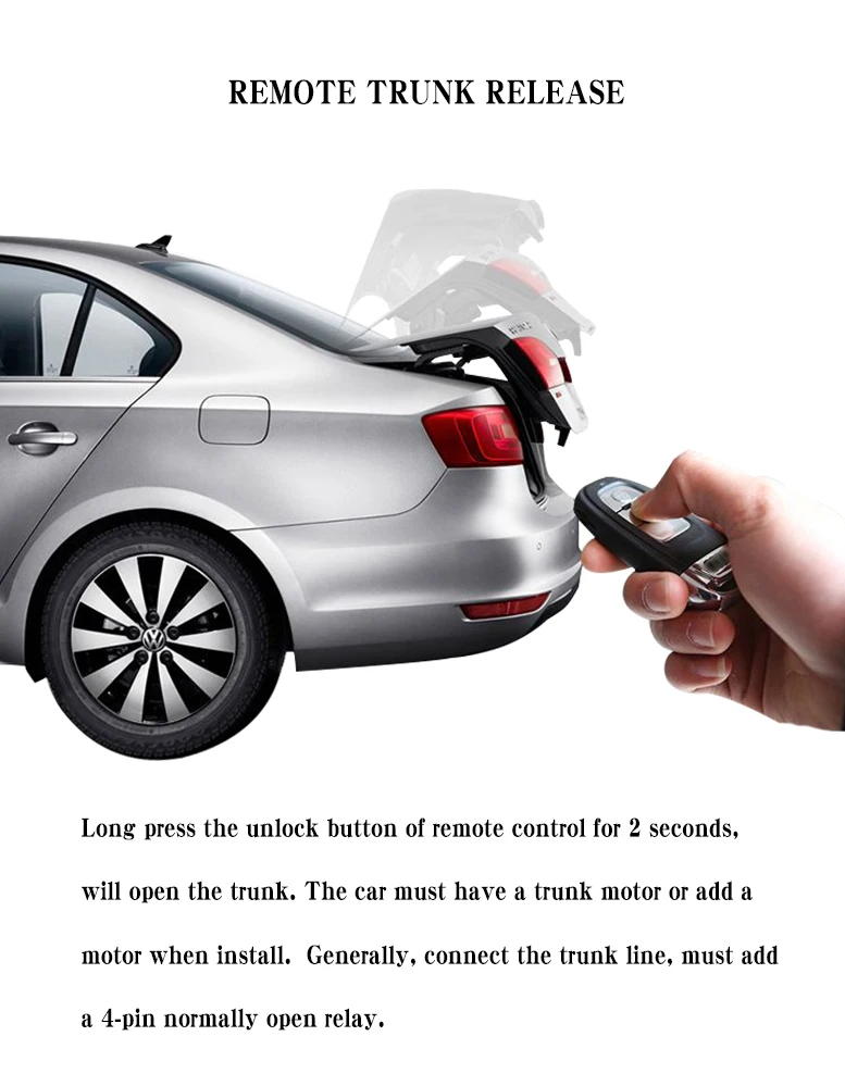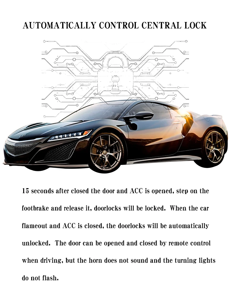 close the car-doors, remote control to open the trunk, lock car-doors when driving, unlock car-doors when the engine flameout, open door flashing and other functions , is a good choice to increase anti-theft performance of your car.